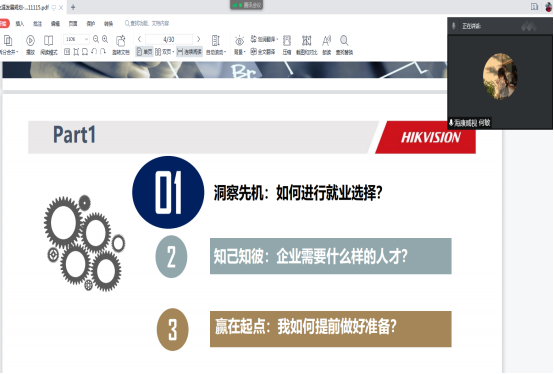 (通讯员:张颖旭、骆训凤)扬帆梦想,规划职场,共筑未来。为系统提升大学生职业生涯规划意识,引导新生做好校园生活安排,树立积极向上的价值观,为实现充分就业、高质量就业打好基础,永利集团y23455于2021年11月17日19:00,开展2021级新生线上职业规划教育,本次课程由海康威视公司何敏经理主讲,2021级全体同学参与此次活动。