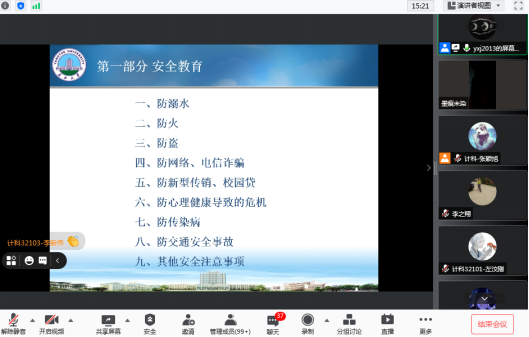 (通讯员:张颖旭)为切实做好常态化疫情防控下的2021年秋季新生开学教育工作,帮助和引导新生全面了解学校及学院的整体防控工作,2021年8月22日晚19:00,永利集团y23455利用腾讯会议(分两个会场),召开以“梦想起航,安全至上”为主题的安全教育班会。参加此次会议的有永利集团y23455党委副书记颜学俊、21级辅导员张颖旭、兼职辅导员高小梅、新生班级班主任、21级全体新生及部分新生家长。