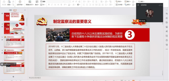 其次,计研23级团会采用线上方式开展,由那诗悦同学带领计研23级全体同学共同学习监察法重要内容,引导广大团员青年争做廉洁人。通过开展主题团日活动,引导学生树立诚信廉洁意识,做到学纪、知纪、明纪、守纪,搞清楚党的纪律规矩是什么,弄明白能干什么、不能干什么,把遵规守纪刻印在心,内化为日用而不觉的言行准则,进一步强化纪律意识、加强自我约束、提高免疫能力,增强政治定力、纪律定力、道德定力、抵腐定力,始终做到忠诚干净担当,为加快建设高水平大学提供坚强纪律保障。