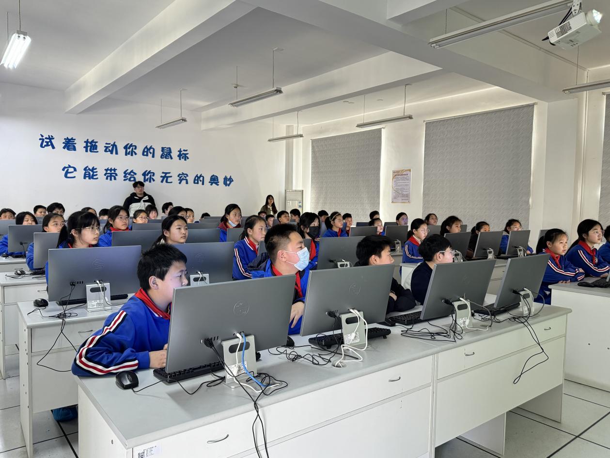 活动伊始,志愿者成贝尔迅采用通俗易懂的语言,借助趣味十足的动画和生活中的实例,将抽象概念具象化为可触摸的思维游戏。当看到通过代码实现小坦克自由移动并发射子弹的演示时,孩子们眼中闪烁着好奇的光芒,课堂里顿时响起此起彼伏的惊叹声。“编程是不是很难呀?”“机器人是不是都要靠编程来控制呢?”面对这些天真烂漫的问题,志愿者们结合 Scratch 软件操作界面,用“代码积木”的比喻形象解释编程逻辑,鼓励孩子们勇敢尝试基础代码编写。