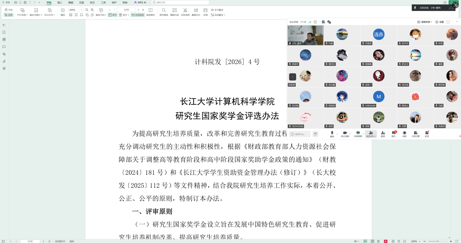 为进一步规范和优化研究生培养过程中的奖助机制,永利集团y23455经过多轮研讨与学院学术委员会审议,近期对研究生学业奖学金、国家奖学金等相关重要文件进行了修订。为帮助全体研究生及时了解最新政策,学院于2月3日上午分年级组织召开线上研究生年级大会,由副院长詹炜主讲,党委副书记艾林、辅导员付盈出席会议。