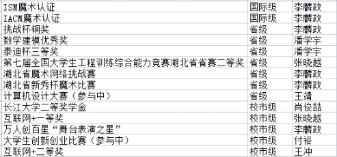 三、班级建设方面--建立核心,完善制度 开学始初,同学们通过演讲竞选班委,班委是民主选举产生的,形成有效的管理机制秉持“以人为本,以班为纲”的治班理念。 班干部们以身作则,以全责为己任,密切协作,按要求完成了学校学院安排的各项任务。 一个集体就是一个家,同学们来自大江南北,有着不同的口音,有着不同的习惯,汇聚于此,一切又是那么默契,那么自然,班里每个同学都十分配合学校的各项大小事务,认真做好每一件事,争创文明寝室、和谐班级。 以下是我们班同学在这一学年取得的获奖情况(部分):