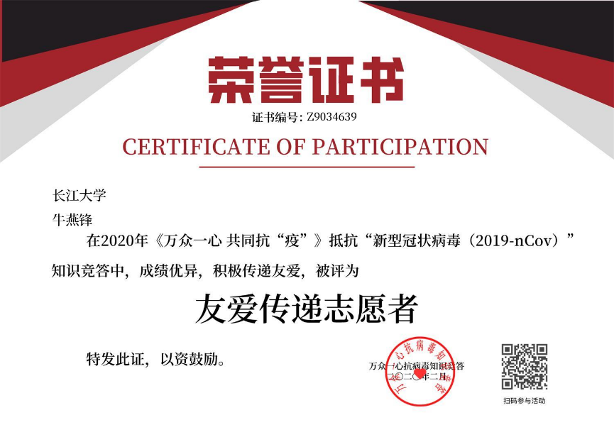 在隔离期间,牛燕锋通过学习强国等途径实时关注疫情发展动态,在2020年《万众一心共同抗“疫”》抵抗“新型冠状病毒”知识竞答中,先后获得了“优秀奖”,“爱心大使”,“友爱传递志愿者”三个荣誉证书,并将自己学习到的预防疫情相关知识通过微信等通讯方式及时告诉家人、同学。