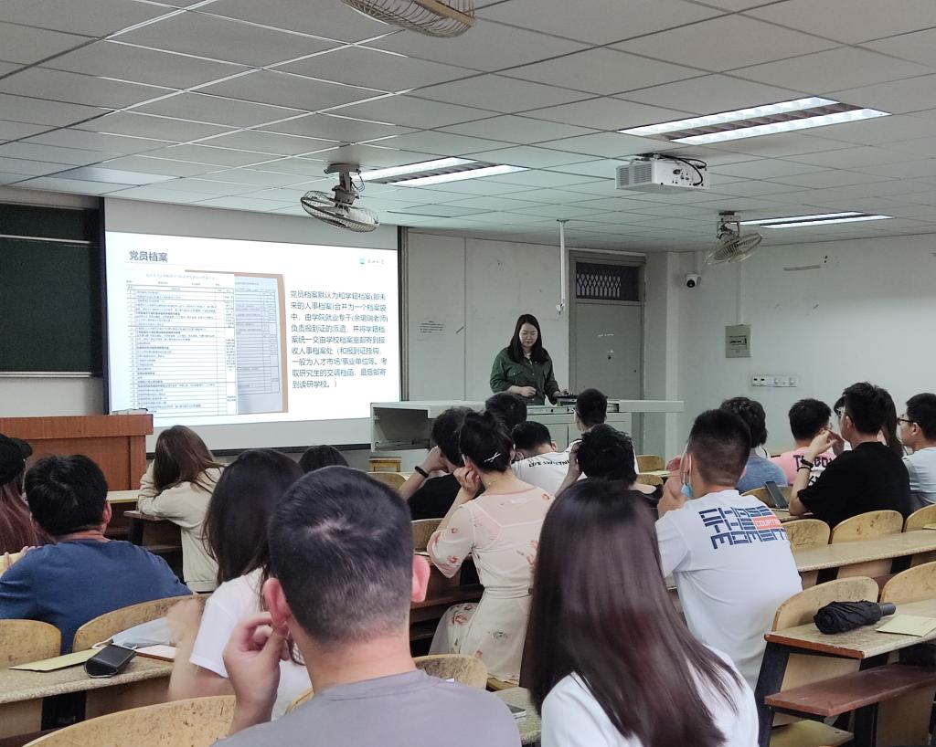 首先,周老师从党员档案、党员组织关系转接、注意事项这三个部分展开,对毕业生党员组织关系转移事宜进行了讲解。提醒毕业生党员重视党组织关系的转接、及时跟进,毕业后尽快落实和完成转接事宜,转接完成后也要及时联系新的党组织参加党员活动、接受党组织的教育。