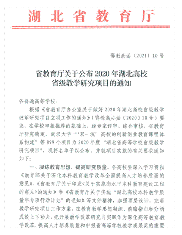 近日,湖北省教育厅印发了《省教育厅关于公布2020年湖北高校省级教学研究项目的通知》(鄂教高函[2021]10号),永利集团y23455共获3项,获批立项数创下近10年来一次性立项数新高。