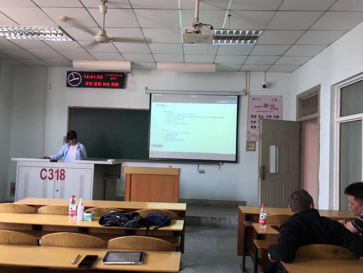2022年5月20号下午14:00,永利集团y23455研究生学术论文报告会第七讲在东校区13教C318顺利举行。经过院长崔艳荣教授、副院长宋文广教授、副书记颜学俊老师的合理安排,学工办付盈副教授、教学办黄静老师的精心组织,永利集团y234552022年研究生学术论文报告会第七讲顺利开展。学术论文报告会由硕士生导师胡杰、魏登峰老师莅临指导。