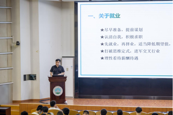 紧接着,余珺瑞老师做就业政策讲解。他列举了参加招聘会需要具备的材料和专业能力,并介绍网签的相关事宜,希望大三学子尽早开始为求职做好准备。随后,他结合学院近四年考研数据,建议打算考研的同学要根据自身情况做好规划,科学择校,切忌随大流,并介绍了毕业生入伍的优势。他希望各位同学量力而为、积极准备。