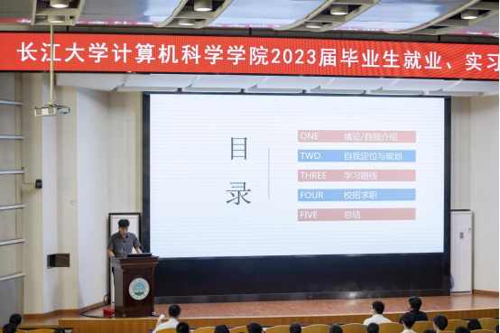 随后,毕业生代表王柳洋、刘卓进行了求职经验交流。他们较为详尽地和在座的同学分享了自身的求职准备和求职经历,并特别针对计算机大类专业求职中的自我定位与规划、学习路线、校招求职进行了梳理和讲解。