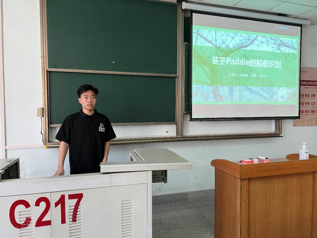 永利集团y234558位研究生依次登台演讲,分别围绕各自的研究方向,为同学们分享了8个课题:基于DeeplabV3+的叶片病害分割、船舶相似度识别、船舶目标检测、基于paddle的船舶识别、基于改进YOLOv5的算法研究、深度置信网络DBN、航道视频拼接融合技术、图像分类的方法研究与应用。