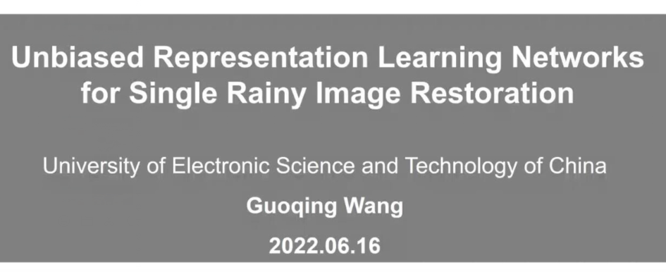 王国庆教授的报告题目为“图像去雨模型设计中的表征学习方法探索”。王教授对现有基于CNN的图像去雨模型进行剖析并指出其主要缺陷;随后以“编码器-解码器”网络为基础架构深入探讨了如何学习更好的结构化表征,从而避免现有模型问题并得到更好的去雨结果;最后,通过将所设计方法应用于不同感知任务和智能无人系统验证所提出模型有效性,并从模型设计和无人系统应用两个角度指出图像去雨研究的未来方向。