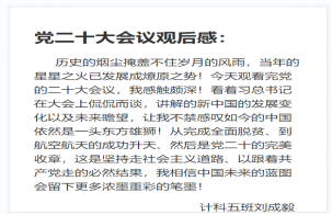 计科12003班余宗懋习:习近平总书记在二十大报告中强调,到二〇三五年,我国发展的总体目标之一是建成教育强国、科技强国、人才强国、文化强国、体育强国、健康中国,国家文化软实力显著增强。二十大标志着高等教育高质量发展进入快车道,越来越多的学子将会得到更全面、更多样、更高质的教育资源。作为一名学生干部,我将继续努力学习,练就过硬本领;踏实工作,服务师生,为学校建设尽一份力,为祖国发展时刻准备!