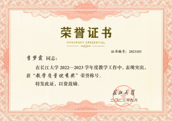 陈应霞老师荣获2022-2023年“优秀教学管理工作者”荣誉称号