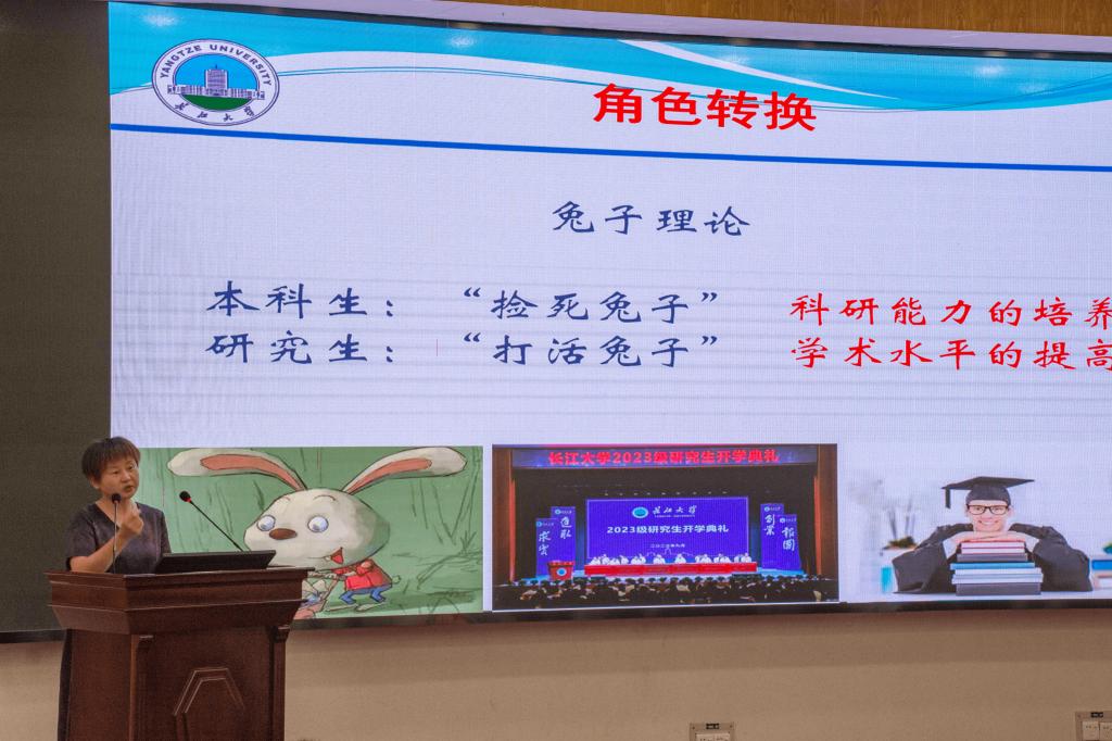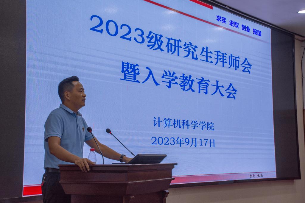 院长崔艳荣以“欢迎、祝贺、感谢”开篇,欢迎新一届研究生的到来,祝贺大家成功上岸,感谢支持和培养学生的家长们和老师们。并以“兔子理论”为例,指出计科学院的55名导师、三大科研平台、学术讲座等平台将全方位助力大家“打活兔子”。并对2023级研究生提出三点希望:品行高洁,志存高远,履践致远,成为一名高素质的数智青年。