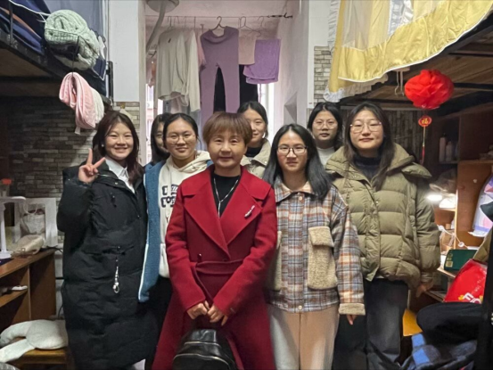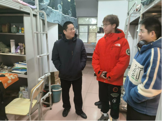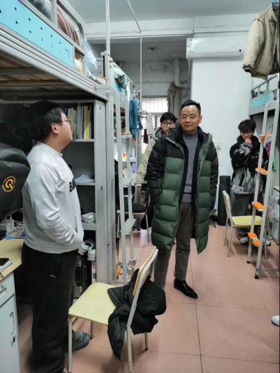 走访期间,崔艳荣院长与学生亲切交谈,关心学生健康,了解学生住宿情况,叮嘱同学们有任何困难第一时间找辅导员。郑健书记提醒同学们冬季用电安全,时刻注意防火,自觉遵守学校各项安全管理制度。刘波涛副院长不仅关切的询问了同学们的学习情况,还在交谈中为同学们解答了专业学习的疑问,让同学们对计算机专业充满信心!院长助理雷鸣老师就“大学生活应该怎么过”这一问题与同学们展开深入交流,幽默风趣的语气引得周围寝室同学围观。除此之外,肖彬副书记还询问了同学们的英语四级备考情况,提醒同学们临近期末,要投入更多精力专心备考,争取期末取得一个好成绩。