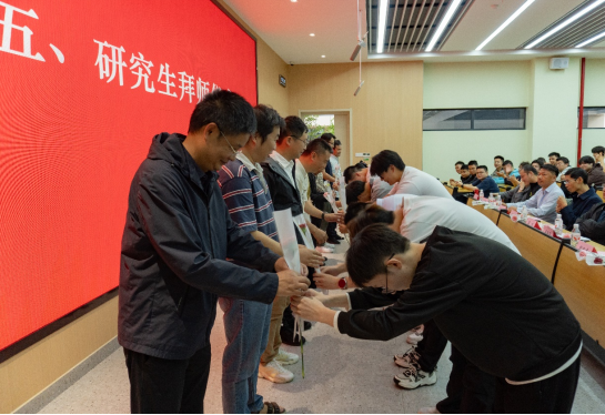 典礼现场最受瞩目的环节,当属庄重的拜师仪式。2025级研究生依次向各自的导师深深鞠躬,并献上代表感恩与敬意的鲜花。这一“躬”,承载着对学术传统的敬畏;这一“献”,传递着对知识传承的承诺。简短而隆重的仪式,不仅让“尊师重道”的优良传统在现场落地生根,更标志着全体新生研究生涯的正式开启。