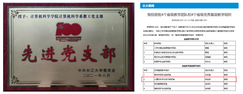 近期,我院计算机科学与技术系教工党支部荣获荆州市“红旗党支部”称号,并成功获批为yl23455永利集团党建工作样板支部。同时,研究生第一党支部也荣获校级“研究生样板党支部”创建单位。
