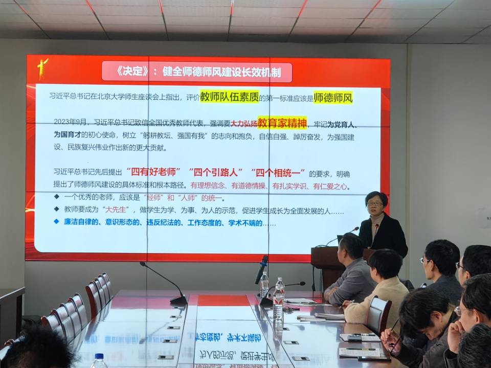 为深入学习贯彻党的二十届三中全会精神,全面加强师德师风建设,11月21日,学院邀请刘小燕教授为全体教职工作党的二十届三中全会精神宣讲报告,并开展师德师风专题教育。报告会由学院党委书记郑健主持。